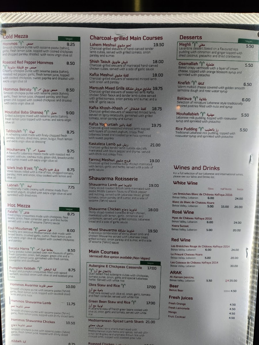 The drinks menu includes Lebanese wines, fresh juices like Mint Lemonade, and a satisfying cup of Arabic Coffee to finish. Dessert options such as Baklava and Mouhalabieh (milk pudding with rose water) round off the experience with fragrant, delicate sweetness.